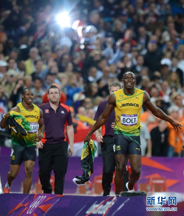 8月5日,博爾特(右前)在奪冠后慶祝。當日,在2012年倫敦奧運會男子100米決賽中,牙買加名將博爾特以9秒63奪得冠軍,并打破奧運會紀錄。 新華社記者楊磊攝