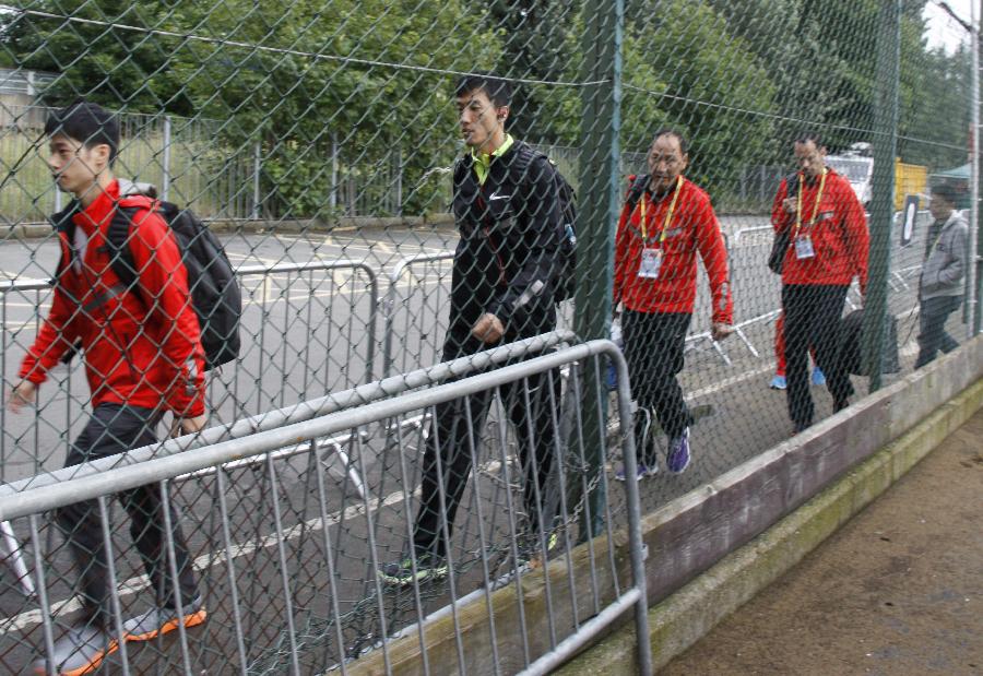 7月13日,中國選手劉翔(左二)離開賽場。在7月13日自己29歲生日這天,劉翔因為預賽之后出現的肋部不適,退出了鉆石聯賽倫敦站的110米欄決賽。 新華社記者王子江攝