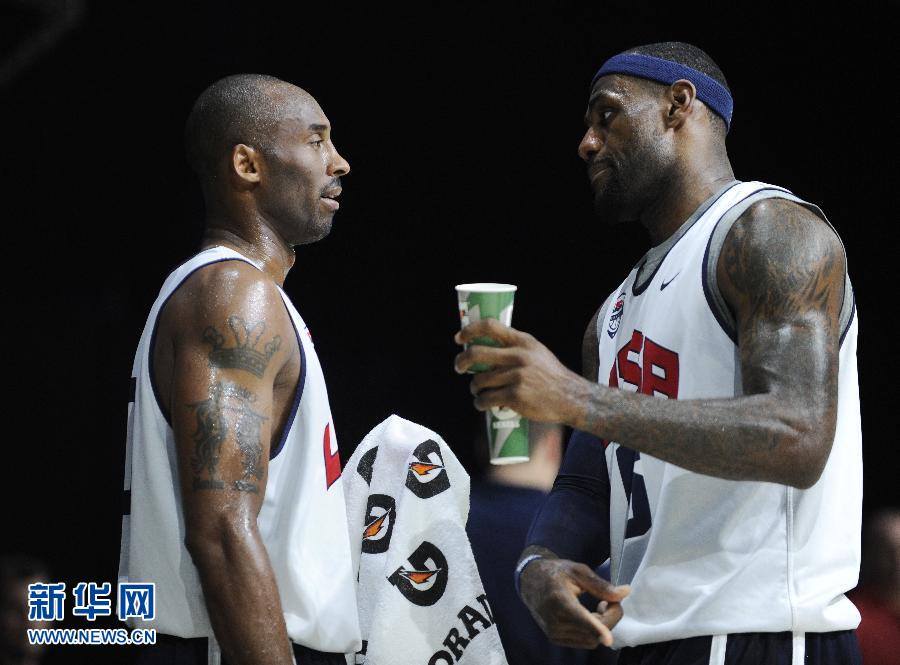 7月14日,科比(左)和詹姆斯在訓練間隙交談。當日,美國國家男子籃球隊在華盛頓舉行公開訓練,備戰倫敦奧運會。 新華社記者張軍攝