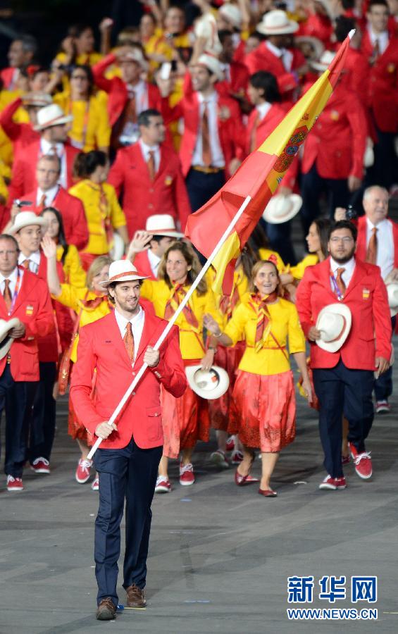 7月27日,第三十屆夏季奧林匹克運動會開幕式在倫敦奧林匹克公園主體育場“倫敦碗”舉行。這是開幕式上,西班牙籃球運動員保羅·加索爾(前)執西班牙國旗入場。新華社記者楊磊攝