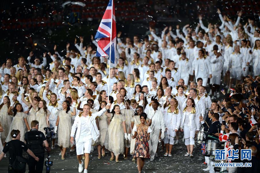 7月27日,第三十屆夏季奧林匹克運動會開幕式在倫敦奧林匹克公園主體育場“倫敦碗”舉行。這是英國代表團入場。 新華社記者楊磊攝