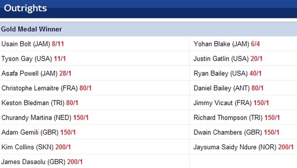 在男子百米奪冠賠率方面,北京奧運會冠軍、世界紀錄保持者牙買加人博爾特雖然近期表現不佳,但依然以8/11的賠率高居榜首。去年大邱世錦賽冠軍布雷克以6/4位居第二,他在牙買加國內選拔賽中100米和200米雙殺博爾特,狀態驚人。美國雙雄蓋伊和加特林以及牙買加的鮑威爾分列奪冠賠率的3-5位。