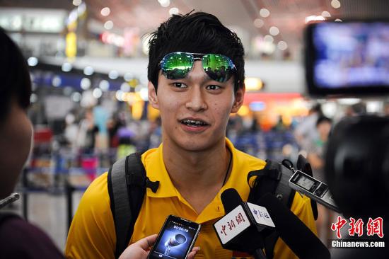 7月8日,中國游泳隊第二批隊員從北京首都國際機場出發,踏上倫敦奧運會征程。中國游泳隊頭號明星孫楊在接受記者采訪時表示,有信心至少帶回一枚金牌。中新社發 劉震 攝