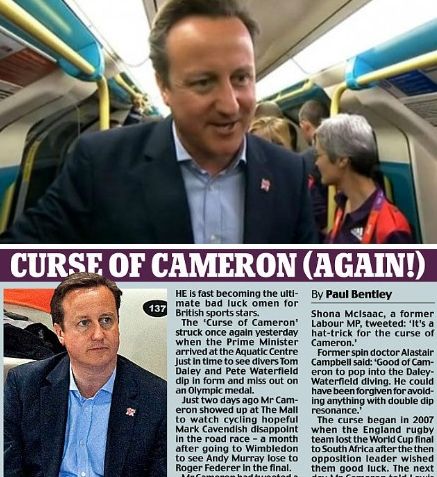 在英國舉辦的奧運會,英國首相戴維-卡梅倫可沒閑著,不僅為奧運順利舉辦忙前忙后,還在百忙之中抽空趕到賽場為本國運動員加油。只是,卡梅倫的運氣似乎不太好,看啥啥輸,戴利加油組合在他的注視下無緣男子雙人十米跳臺獎牌后,甚至被英國媒體用“curse of Cameron again(又見卡梅倫的詛咒)”來調侃。