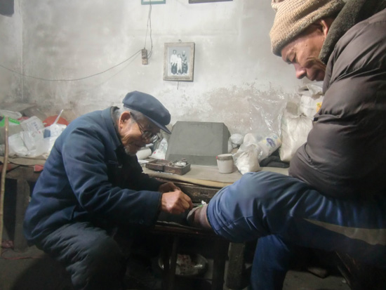 12月13日上午,記者來到張玉友家。這是一所老宅院,房子破舊,院落狹窄。兩間小西屋,陳設(shè)簡陋,是張玉友給人看病的地方,記者進來時,已是85歲高齡的他,正戴著老花鏡埋頭給一位老人看病。