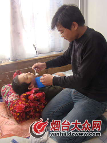 于是,孫成法在校園里找到一處合適的房子,租下了其中一間,每月450元。“我一般早晨4點起床,給母親洗漱、做飯,然后喂完母親吃飯,我再去學校上課。如果沒有課,就在這看書邊陪著母親。”“其實,上大學之前,我在家里媽媽什么活都不用我沾手,現(xiàn)在做飯、洗尿布,包括給母親理發(fā),這些我都學會做了。”當母親意識清醒的時候,和她說說話,是孫成法一天中最開心的時候了。他說,那時他感覺自己好像回到了小時候,依偎在母親的身旁,沒有痛苦和壓力,安靜平和。孫成法告訴記者,有時候的確很累,但看到母親在身邊心里就覺得很塌實。他一邊說著話,一邊將母親從床上扶起,要給她喂水,他讓母親倚著被子,他則跪在旁邊將水一勺一勺慢慢喂到母親嘴里,動作是那么熟練自然,令在場的人紛紛動容,孫成法微微一笑,說每天都這么喂已經(jīng)習慣了。