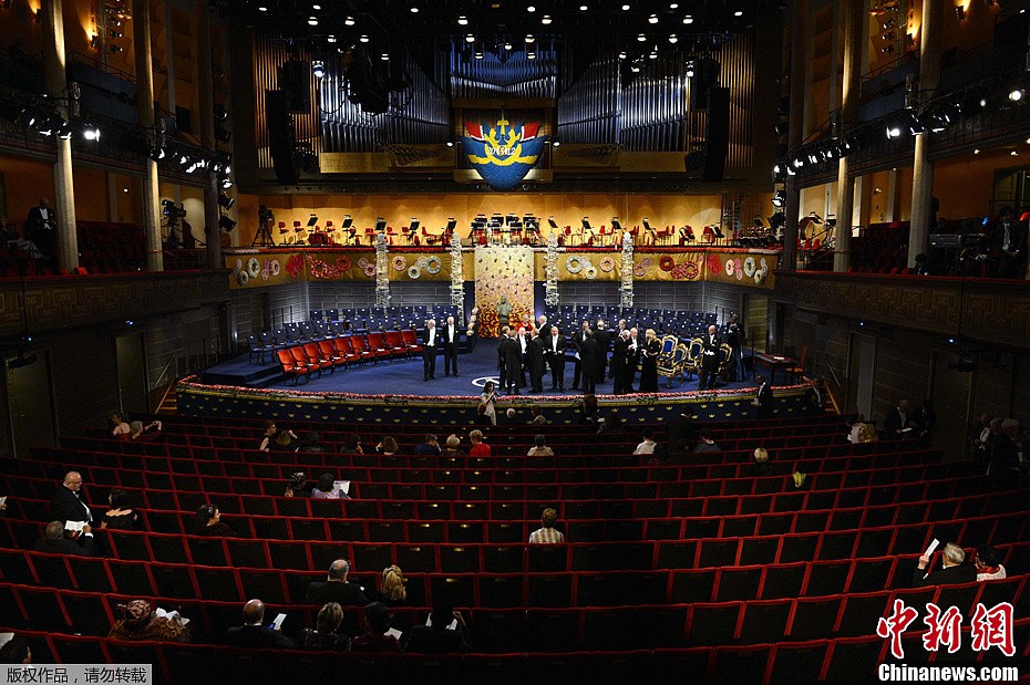 當(dāng)?shù)貢r間12月10日,2012年諾貝爾頒獎儀式在瑞典斯德哥爾摩音樂廳舉行。圖為頒獎儀式開始之前。