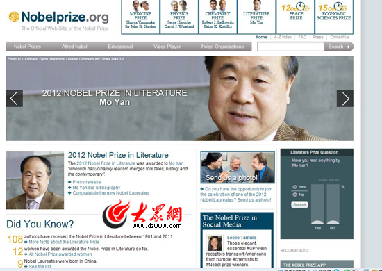 諾貝爾獎官方網(wǎng)站發(fā)布莫言獲獎消息。