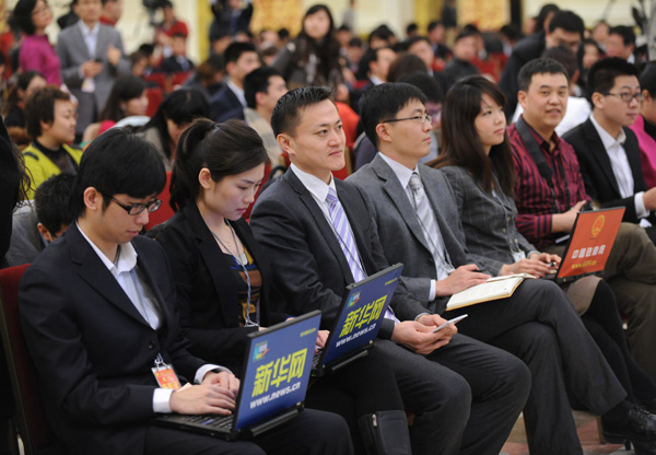 2012年3月4日上午11時,十一屆全國人大五次會議在人民大會堂三樓金色大廳舉行新聞發(fā)布會,由大會發(fā)言人就會議議程和人大工作相關(guān)的問題回答中外記者的提問。圖為新華網(wǎng)和中國政府網(wǎng)記者在發(fā)布會現(xiàn)場。新華網(wǎng) 陳競超 攝