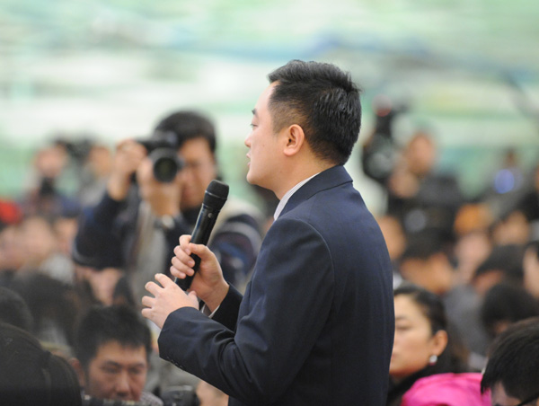 2012年3月4日上午11時(shí),十一屆全國(guó)人大五次會(huì)議在人民大會(huì)堂三樓金色大廳舉行新聞發(fā)布會(huì),由大會(huì)發(fā)言人李肇星就會(huì)議議程和人大工作相關(guān)的問(wèn)題回答中外記者的提問(wèn)。圖為中央電視臺(tái)記者在提問(wèn)。王翰林 攝