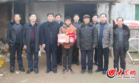 12月5日,記者來到家住趙莊村的宋貴福家中,她的兩個孫子和一個外甥在屋子里歡快地玩耍著。老人激動地向記者講起當天劉培旭救起他們祖孫四人的情況!岸嗵澚诉@個小孩,我一輩子都不會忘記他的!”宋貴福感激地說。宋貴福的兒子趙立強特意做了面“臨危不懼,見義勇為”的錦旗送給東方中學。趙立強說:“劉培旭同學是我們的救命恩人,他的高尚行為我們全家一輩子也不會忘!
