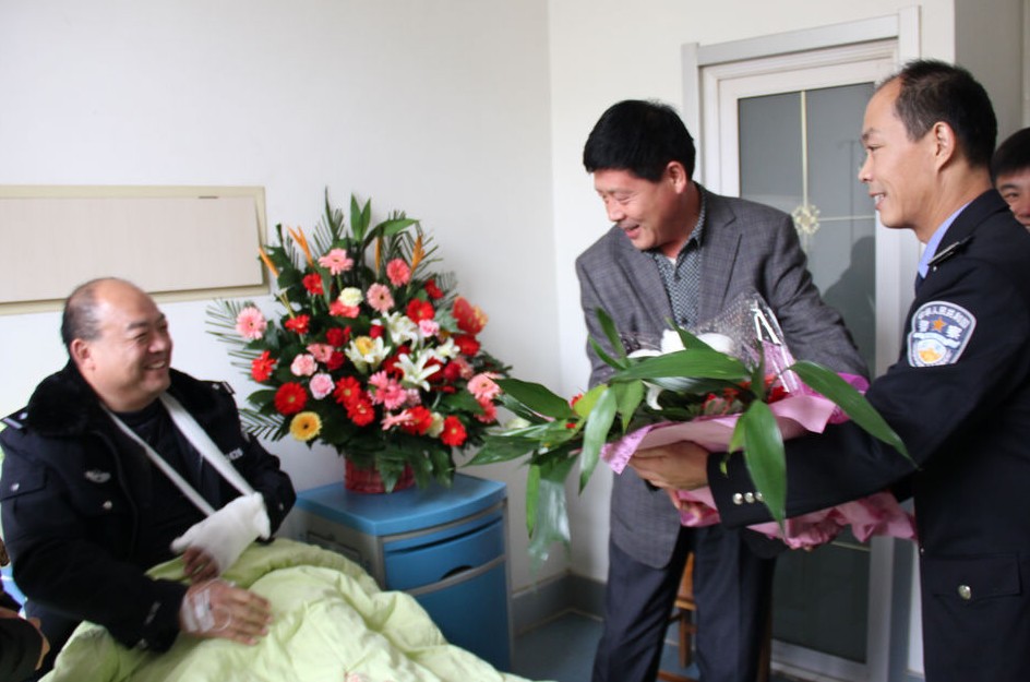 自2011年以來(lái),莒縣果莊、夏莊、安莊、劉官莊、浮來(lái)山、閻莊、棋山等鄉(xiāng)鎮(zhèn)連續(xù)發(fā)生多起入室盜竊案件,嚴(yán)重影響了人民群眾的安全感和滿(mǎn)意度。莒縣公安局刑警大隊(duì)歷經(jīng)半年多的艱苦偵查,逐步摸排出劉方忠、杜治強(qiáng)、黃寶生、杜以副等人有重大作案嫌疑,其中,杜以副、黃寶生分別系沂南縣、臨朐縣警方上網(wǎng)逃犯。2012年11月21日,刑警大隊(duì)經(jīng)周密部署,組織精干警力赴沂南開(kāi)展抓捕行動(dòng),陳文東同志主動(dòng)請(qǐng)纓參與夜間抓捕。當(dāng)日20時(shí)許,抓捕組民警在犯罪嫌疑人杜以副住宅周?chē)睾颍l(fā)現(xiàn)杜以副從胡同步行出來(lái)后,民警立即實(shí)施抓捕。早有所警覺(jué)的杜以副手持匕首刺向民警,“小心!有刀!”陳文東大聲提醒戰(zhàn)友,眼看著犯罪分子揮舞著尖銳的匕首負(fù)隅頑抗,為保護(hù)戰(zhàn)友,制服兇犯,陳文東奮不顧身?yè)湎?/SPAN>杜以副,徒手將其手中揮舞的匕首奪下,抓捕組其他成員一舉將杜某擒獲,發(fā)現(xiàn)杜某手中攥有一大把竊來(lái)的黃金首飾,正企圖攜贓外逃。這時(shí)陳文東才感覺(jué)到身上的劇痛,戰(zhàn)友們將他迅速送往醫(yī)院,經(jīng)檢查,其手臂、手上和小腿多處被刺傷,鮮血浸透了厚厚的衣裳。據(jù)醫(yī)生介紹,陳文東手上的傷多處已傷及肌腱,其中一處已刺到骨頭,另一處只差0.5cm就傷到主動(dòng)脈,一旦刺到主動(dòng)脈那后果真的不堪設(shè)想。而陳文東卻笑著說(shuō)“當(dāng)時(shí)什么也沒(méi)想,就想著快把刀奪下,別讓他傷著其他同志,更不能讓他跑了”。 陳文東同志在面對(duì)持刀的犯罪分子時(shí)無(wú)私無(wú)畏,舍身履職的英勇行為彰顯了公安民警的先進(jìn)典型形象,11月28日,齊魯晚報(bào)、半島都市報(bào)、黃海晨刊、人民網(wǎng)、新華網(wǎng)、大眾網(wǎng)、齊魯網(wǎng)、莒縣電視臺(tái)、日照電視臺(tái)等各大主流媒體分別刊發(fā)報(bào)道陳文東的英雄事跡并給予高度贊揚(yáng)。