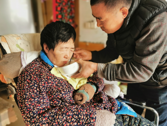 今年53歲的李光峰和李雪麗同是赤李村村民,兩人從小就相識。1990年,兩人走進婚姻殿堂,婚后兩人關系十分和睦。李光峰做瓦工,李雪麗教書。不管是繁重的農活還是瑣碎的家務事,他們都有商有量,從沒紅過臉。隨著女兒的出生,一家人過得其樂融融。天有不測風云,2013年4月,李雪麗田間勞作回家途中發生車禍,重度顱腦損傷,有意識但癱瘓在床,生活也無法自理。從此,李光峰一個人擔起了家庭的重擔。