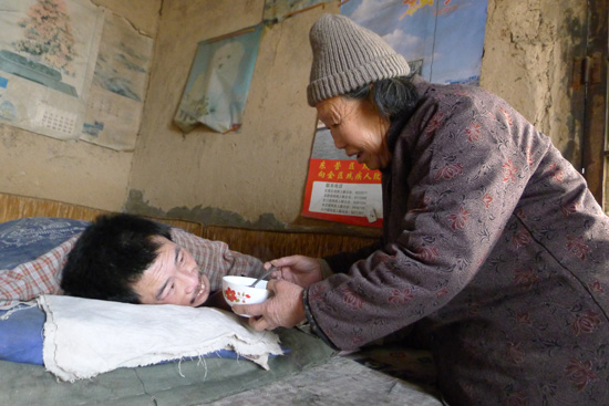 “老伴走了,他想不開,讓兒子把他愁死了。可俺不能也想不開,俺再想不開,建筑咋辦?”堅強的張樂英沒有怪罪兒子,依舊悉心照料他。兒子吞咽動作慢,喝湯時總是喝一半流一半,張樂英就為他準備了很多布片墊在嘴旁邊;兒子不知道冷熱,張樂英總是先嘗好了再喂給他;兒子的被褥雖然舊了,但是張樂英都為他換洗得十分干凈。走進他們的房間,聞不到絲毫的異味。38年來,兒子沒有因為照顧不周而生一點褥瘡。熱心的鄰居們經常到張樂英家串門,為她解悶。大家都夸張樂英待兒子好,為他收拾得干凈。