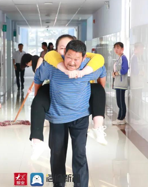在五蓮縣高澤初中的校園里,經(jīng)常會看到這樣的場景:早上,一位老人用電動三輪車載著一個女孩來到教學(xué)樓下,然后將女孩背到三樓的教室里,安頓好了再離去。上午最后一節(jié)課結(jié)束前,老人又會早早來到教室門外等候,一下課,就急匆匆走進(jìn)教室,背起女孩下樓離去。周而復(fù)始,風(fēng)雨無阻,這樣的情景已經(jīng)持續(xù)了三年。這個女孩,就是五蓮縣高澤街道高澤村的何炎格,老人是她的“陪讀爺爺”何志軍。