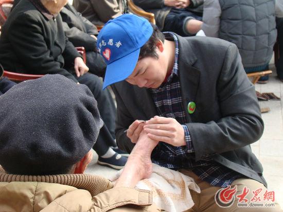 高舉穩(wěn)為老人按摩、修腳