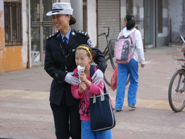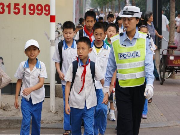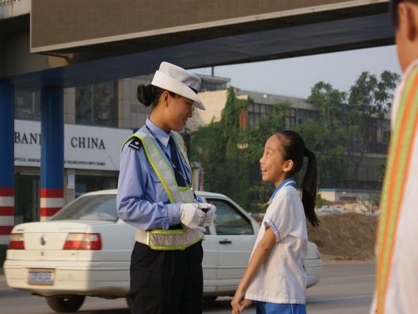三、用心護(hù)佑保平安,大愛無疆贏贊譽(yù)。工作中,并不是所有的孩子都能在放學(xué)的第一時(shí)間就被家長接走,為了保證孩子的人身安全,董蕊都會(huì)把這些孩子叫到身邊,給孩子的家里打電話,及時(shí)和學(xué)生家長取得聯(lián)系,一直到家長從她身邊把孩子安全接走,聯(lián)系不上或不方便接的家長她都直接把孩子送回家確認(rèn)安全后才放心離開。打開董蕊摩托車的后備箱,你會(huì)發(fā)現(xiàn)里面總會(huì)放著一些和工作所用裝備沒有關(guān)聯(lián)的東西。夏天的時(shí)候總會(huì)有幾瓶藿香正氣水,那是隨時(shí)為防止因等家長而中暑的學(xué)生準(zhǔn)備的,冬天的時(shí)候中午在校外吃“小餐桌”不能按時(shí)回家吃感冒藥的孩子總會(huì)從董阿姨手中接過兩粒維C銀翹片,而“邦迪”創(chuàng)可貼則是為受意外小創(chuàng)傷的學(xué)生一年四季必備的。她是一名普通的人民警察,每天無數(shù)次往返在通往學(xué)校的馬路上,她以飽滿的熱情和高度的責(zé)任感投入在附小助學(xué)崗上。每一位家長給她的贊揚(yáng),她都會(huì)報(bào)以微笑,她常說:我是一名人民警察,我的責(zé)任就是為人民服好務(wù),讓群眾放心,也請(qǐng)群眾相信我們。我會(huì)把快樂與笑聲帶給每一個(gè)孩子和家長,把每一名學(xué)生都看作自己的孩子。沒有豐功偉績,沒有鮮花榮譽(yù),在附小這個(gè)平凡的崗位上董蕊用她的的一腔熱情和實(shí)際行動(dòng)獲得了學(xué)生們的歡迎,得到了家長的信任和學(xué)校以及社會(huì)各界的一致認(rèn)可和好評(píng),大家都親切的稱她為“小董阿姨”。附小助學(xué)崗已成為洸河路一道靚麗的風(fēng)景線。