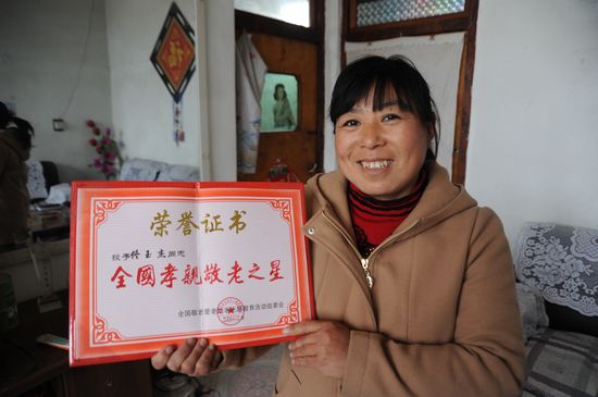自從1997年到羅家村以來,佟玉杰任勞任怨,默默付出,照顧三位老人,四鄰街坊都夸贊她這個外來的好媳婦。10年來,她和丈夫從來沒買過一件像樣的衣服,賣肉、買菜總是掂量著花,有了好吃的、好用的,一定要先讓老人享受。