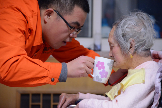 為了照顧老人,楊爽每天早上5點左右就得起床,騎自行車走5公里路趕到老人住的出租屋,給老人穿衣、刷牙洗臉、換尿布,再把老人抱到椅子上喂早飯,然后再急匆匆趕到單位上班;中午,顧不上吃飯,他就得趕回出租屋,幫老人敷藥按摩、換洗床單、喂飯……晚上,還要給老人擦洗身體、量血壓、喂藥,等服侍老人睡覺后,他才踏著月光回家。由于老人常年臥床,患了嚴重的肺病,為減輕肺部壓迫感,楊爽每天都要盡可能多地把老人抱下床活動活動身體,每天要幫老人捏身體至少2個小時,碰上老人排便困難,他們就用手指一點點摳出來……