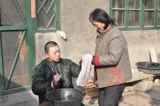 將孩子接到家后,撫養這個殘疾孩子成了劉秀平生活的重中之重。其中的艱辛,村里人看得最清楚。“洗衣做飯、端屎端尿,照顧的無微不至,生怕一點兒不周到的地方。如意眼睛看不見,就講故事給他聽;如意在家里呆著悶,就推著三輪車帶著他在村里曬太陽;如意想吃水餃,就抓緊調餡兒做出一頓美味的水餃。說實話,親娘也就是做到這份上。”提到這些,黃啟亮一臉敬佩,