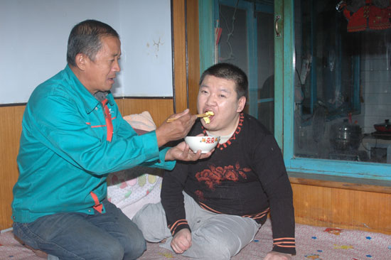 隨著兒子病情的穩定,張鼎成夫妻倆漸漸習慣了這種生活,每天夫妻倆不厭其煩地給兒子一口一口地喂飯,然后給他擦洗身子,把換下的尿布清理干凈。夏天,為避免兒子長痱子,這樣的工作每天要重復更多次數,走進這個平凡普通的農村院子,繩子上常年晾曬著兒子的尿布。當別人都享受著兒女承歡膝下,父母頤養天年的歡樂時,張鼎成卻在照料著體重比自己還要重的兒子。在夫妻倆眼里盡管兒子智力上與正常人有差別,生活上不能自理,但是每天看到孩子,總覺得生活還有希望。“只要我們不放棄,兒子一定會好,現在就是拼盡全力也要照顧好他”,夫妻倆深夜經常這樣相互鼓勵。日子雖然艱難,但兩個人相濡以沫、同舟共濟,一切都在有條不紊的進行,日子也在平靜中慢慢度過,一年、一年……。