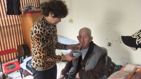 老人從1998年4月骨折后一直沒有愈合,至今全身癱瘓,大便不能用力,他們每天給李玉柱喝調醋的蜂蜜水,還準備了一摞膠皮手套。老人大便時,他們就先用開塞路通便,然后帶著橡皮手套用手往外摳。每到夏天,房澤秋每天都會給老人洗澡,這么多年,老人身上沒有長一個痱子,生過一個褥瘡。老人的床鋪、衣物收拾得很干凈,就算靠近跟前也聞不到一點異味。老人每年去醫院充兩次血,以前住平房的時候,于海背著老人蹬三輪車去醫院。1990年他們搬到制錦市小區四樓的一室一廳,每次看病于海都背著老人上下樓,打出租車去醫院。