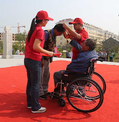 鶴山鄉崔河村趙吉德老人為悉心照料自己多年的女婿董現亮戴上“感動人物”獎牌。