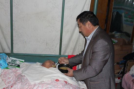 伴隨著年齡的衰老和病情的加劇,父親的身體素質(zhì)明顯下降。雖然骨壞死病經(jīng)過四年的治療已基本痊愈,但腦血栓病卻一天天加重,剛開始他走路不得不用雙拐,后來走不動就坐輪椅,再后來就躺倒了床上,如今已躺床5個年頭,并且大小便不能自理,起床、吃飯都需要伺候。母親多病,今年82歲,身體條件差,晚上照顧體重170斤的父親,非常困難,父親晚間大小便更需要照顧,他就搬到父親房間和他一起住,為他喂水喂藥、換尿布。由于父親生活不能自理,他的吃喝拉撒都需要有人照顧。每到吃飯,一勺一勺喂飯成了家常事,可以說是常年累月,習(xí)以為常了。因為躺床,父親的大小便全由人伺候,白天還好辦點,每到晚上不僅要換尿布,還要換屎布。除此之外,他還堅持經(jīng)常給老人洗澡、擦身子、按摩。因此父親身上從未生過褥瘡。在老人的屋里,聞不到絲毫異味。伺候病重的父親已20余年了,可屋漏偏逢連陰雨,沒想到患有大腦智障的哥哥去年因為血壓偏高,也患上了腦血栓,躺倒了床上,生活不能自理,又一重?fù)?dān)壓在了張清鋒的肩上,但他從沒嫌棄過、、、、、、。面對這種情況,他想,每個人都可能有生病的時候,都有衰老的時候,到那時,自己的子女和兄弟如果不管不問,自己的心情又該如何呢。為了伺候好父親、哥哥,他盡量把時間安排緊湊,在不影響工作的同時,擠出時間回家給他們喂藥換尿屎布,保證他們身體干凈衛(wèi)生。