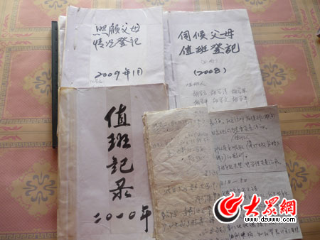 從2005年起,他們開始記錄《孝敬父母值班筆記》,《值班筆記》上詳細(xì)羅列了值班人、時(shí)間、本月給父母購(gòu)置的東西、錢數(shù)、值班期間父母飲食生活怎樣、身體精神怎樣、值班人做了哪些工作(指生活調(diào)劑、衛(wèi)生等)、向值班人提出要求等條目,每一條都記錄的非常認(rèn)真詳細(xì)。《值班筆記》卷首寫著“兄妹之間要團(tuán)結(jié)和睦,不斤斤計(jì)較,能相互諒解,相互支持,贍養(yǎng)好伺候好老人、以實(shí)際行動(dòng)來(lái)報(bào)答父母的養(yǎng)育之恩”。胡成樂(lè)的七個(gè)兒女,年齡最大的已年過(guò)70,最小的也40多歲了。但九年來(lái),不管因?yàn)槭裁丛颍麄儚奈础翱者^(guò)崗”,誰(shuí)有事忙不開了,其他兄弟姐妹都會(huì)爭(zhēng)著來(lái)代班。2007年,胡家兄妹又進(jìn)一步完善了伺候父母的措施,將其整理成《伺候父母過(guò)好晚年生活》的照顧指南,人手一份,里面著重指出每人都要帶著笑臉值班。說(shuō)起“帶著笑臉”,大哥胡學(xué)云說(shuō):“父母為我們辛苦操勞了一輩子,把我們培養(yǎng)成社會(huì)需要的有用之才,功不可沒(méi),現(xiàn)在他們老了,我們更應(yīng)該尊敬他們,不管發(fā)生什么事,回到家都要笑臉相迎,絕不給父母甩臉子,這一點(diǎn)我們都互相監(jiān)督”。