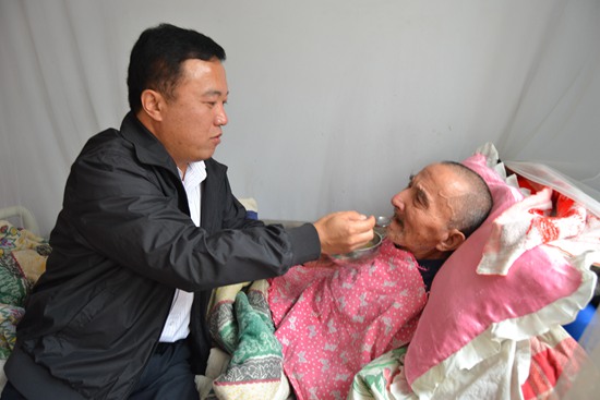 這幾年間,天氣暖和時,老人在東平縣湖西老家居住,由孟昭軍的岳母照顧還能維持。孟昭軍給岳父添置了四腿雙拐、輪椅、大小兩種坐便器。每周都去照看,送藥品食品和蔬菜,刮風(fēng)下雨從來不間斷。從2005年冬季開始,由于老人的病怕冷,農(nóng)村老家取暖條件差,每年天氣一變冷,孟昭軍就將岳父岳母接到自家居住(二女兒家房子小),到第二年春天氣溫暖和,再回老家,一住就是4個多月。盡管家里人擁擠點(diǎn)了,但是和老人住在一起,照顧更方便了。孟昭軍常說,“和老人住在一起,心里踏實(shí)”。