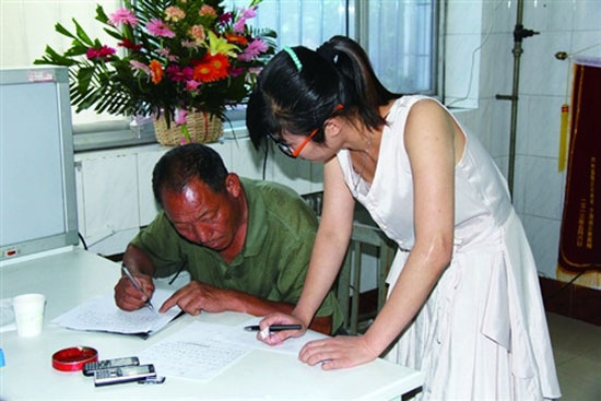 7月1日14時,李再響和妻子面前擺了一份捐助器官同意書,兩個人識字不多,但還是清楚的知道協議書中的內容。在紅十字會工作人員的幫助下,李再響先簽了字,但手還是抖了幾下,妻子接過李再響遞過來的筆,一邊簽字,一邊哭,工作人員輕輕拍著她的肩膀。
