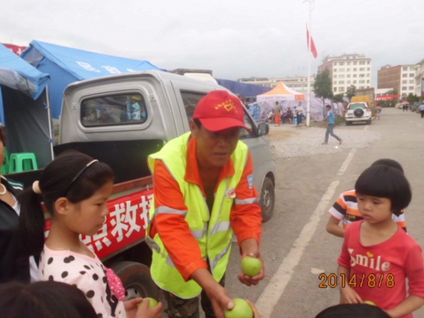 他的妻子王均花給他煮了幾十個雞蛋,買上了二十斤煎餅,院子里自己種著大蔥,拔了一捆大蔥,從街上買上了水果、礦泉水。8月4日11點,載著日照人民的深情厚誼,趙龍海開著他的小貨車奔赴云南魯甸。經過五千多里的疾駛,8月6日下午,趙龍海來到了魯甸。趙龍海到了當地民政部門,請求加入救援志愿者隊伍。