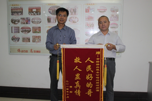 10月10日下午,山東榮信集團業務經理賀彬帶著錦旗來到日照市交通運輸局辦公室,對陸橋出租公司駕駛員劉祥河見義勇為的行為表示感謝。