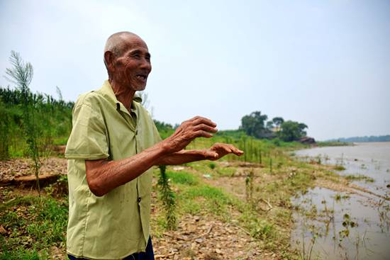 高元珍老人在河邊向記者回憶當時救人的場景