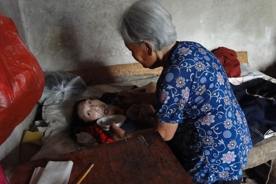 經(jīng)過了漫長的求醫(yī)之路,徐福寨的病情一直沒有好轉,終年在床上躺著,身體不能直立,不會說話,只會發(fā)出"啊,啊"的聲音,但田文英夫婦憑著音調(diào)的轉換能聽懂兒子在"說"什么,是渴了、餓了、尿床了、生病了。就這樣日復一日,年復一年,田文英夫婦每天的任務就是燒飯、喂食、擦澡、洗衣、下地勞作,為這一個病殘的兒子,夫婦倆一輩子沒睡過幾個安穩(wěn)覺,沒敢出過一趟遠門,三鄉(xiāng)五里的走趟親戚也不敢留下來吃飯。