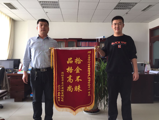 4月17日在河口區政務服務中心二樓大廳招投標報名窗口,一位前來報名的投標供應商不小心將錢包遺忘在了報名窗口,李永忙完工作之后在地面上發現了錢包,打開一看,里面裝有3000元現金、身份證和銀行卡、醫保卡等幾十張卡,此時,李永意識到失主肯定心急如焚,他馬上打電話聯系失主,前后打了十多次,奈何一直不通,事后知道失主在高鐵上,信號不通;李永隨即將錢包鎖在廚子里妥善保管。次日早上,電話終于通了,原來失主是濰坊宜華醫療器械有限公司陳經理,他已經回到了濰坊,失主聽到李永的敘述之后非常欣慰和感謝,失主說:“他自己昨天找了一天以為肯定是丟了,心想丟點錢是小事,補辦那些證件不僅需要一個月還耽誤其他地市的投標報名,要是這些證件找不到損失就大了,壓根想不到有這么好的人能將他的錢包還給他,太感謝河口區國有資產運營管理中心的小李同志了!”他們商議兩天之后領取失物,兩天后失主如約而至,李永核實失主相關的證件,確認無誤后將錢包完好的交給了失主,失主當場拿出一部分錢交給李永以示感謝,李永婉言謝絕了,陳經理非常感動,為了表示衷心的感謝,來到單位送上一面“品格高尚 拾金不昧”的錦旗。