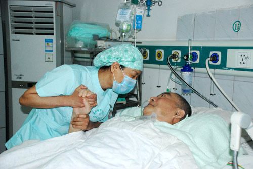 依靠多年的經驗,李秀梅懂得在病人脆弱的時候,適當的安慰有時會起到很大的作用,在監護室內,只要有患者意識清醒,她便過去與患者交流,為患者加油鼓勁兒,記者看到,李秀梅緊握患者的雙手,在患者耳邊輕輕地說了幾句,患者雖已說不出話,但伸出了大拇指來回應她,此時此刻,在一旁的人們無不為之動容。李秀梅說"重癥科里有很多老人,有時候他們就像個孩子一樣,也會耍耍小脾氣,這時候需要我們護士給他們更多的安慰和鼓勵,用心去呵護他們。"