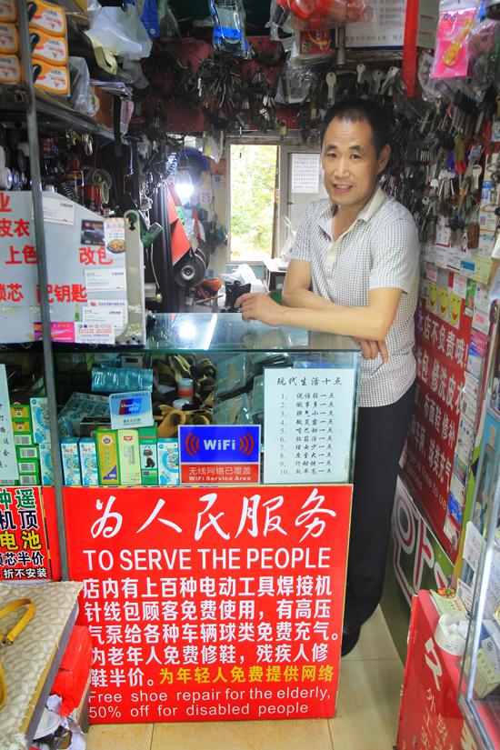 李秀現的謀生手藝是修鞋。古田路14號碧瑤灣小區6號樓東側的“李記鞋藝”,就是他的的小店面。走過去,便看到幾排醒目大字:“店內有上百種工具和針線包免費使用。提供氣泵氣管免費給各種球類充氣。為70歲以上老人及殘疾人修鞋半價,80歲以上修鞋免費,上門服務。為年輕人免費提供網絡。”