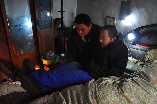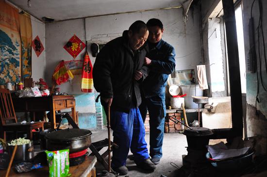 2010 年的一天,半夜 12 點,焦圣安剛入睡。放在床頭柜上的手機突然急促地響起來,號碼顯示是刁黎明打來的,原來是老人摔倒了。電話那頭的老人聽上去非常不舒服,焦圣安放下電話,二話沒說, 穿上衣服,騎著摩托車就趕到了刁黎明家,叫著老人一個鄰居一起將老人扶到床上。看到深夜趕來的焦圣安,老人感動的流下了熱淚。“從那以后,老人摔倒的頻率日益增加了。”焦圣安緊鎖眉頭說道,“扶他和扶其他健康的老人不太一樣,老人的腿一點也使不上力氣,全身都要壓在別人身上才能起來,我一個人試了幾次都不行,每次都要叫鄰居一起扶起來。”