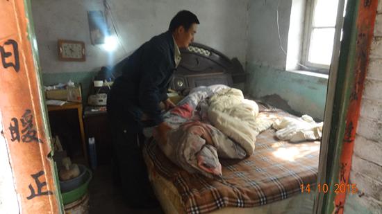 8年前的春天,焦圣安拿著一封薄薄的掛號信,走進了黃前鎮黃前村的村門口,順著門牌號找下去,看到了一個破舊的屋門,敲了兩下發現有個很細微的聲音在回應他。他壯著膽子推開歪斜的木門想要把信放到屋里再走,結果沒想到一股惡臭撲鼻而來。焦圣安定睛一看,低矮的瓦房里,家徒四壁。一位老人抱著黑乎乎的破棉被蜷縮在舊木板床一角。從鄰居口中焦圣安得知,老人名叫刁黎明,無兒無女自己生活了20年,因為腦溢血做過開顱手術。后來康復之后,下半身活動不便,生活勉強自理。老人因為腿腳不便,加上常年不與人來往走動,沒有什么親朋好友,脾氣漸漸變得孤僻。周圍的鄰居也鮮少來他院中落腳,腿腳不便的他因為常年不打掃,院子里雜草叢生,村里小孩子口中都流傳著這是一座“鬼屋” 。