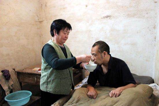 2002年,趙玉蘭退休,可以專心伺候孫源了。然而,幸福在2009年12月13日戛然而止。這天,孫源獨自過馬路時,被一輛疾馳而來的轎車撞飛30多米,鼻子、嘴里都是血,左腿骨折,腦部中度腦震蕩,時而清醒時而糊涂,加之右腿自小無力,只能臥在床上了。自那以后,趙玉蘭再也沒有清閑過,沒睡過一個安穩覺,哪里也去不了。起來一天陪他說話、喂飯喝水、按摩、換尿布,一步也不能離開。“看著孩子這樣,咱受點苦累都不要緊,只要我活一天就照顧孩子一天!”趙玉蘭說。