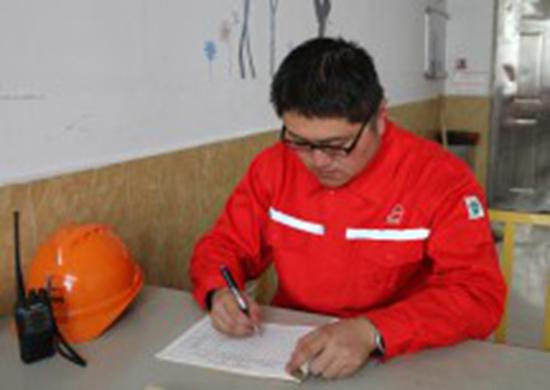 呂利群在采油值班室,認真填寫《采油日報》記錄本,詳細記錄當天的部分生成參數。