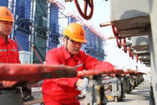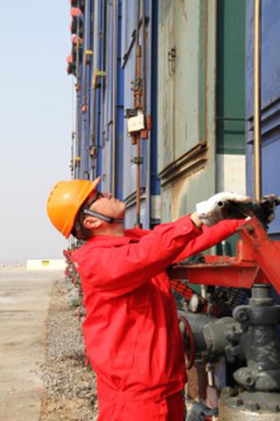 呂利群用活扳手調整原油自動計量器管線上的閘閥壓蓋,確保沒有泄漏。