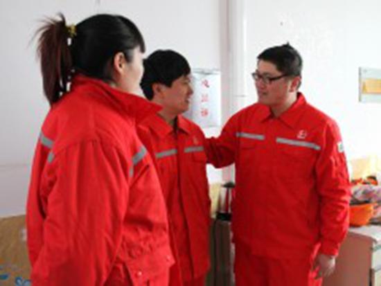 呂利群和班內員工一起談心,舒緩工作壓力,調整情緒。
