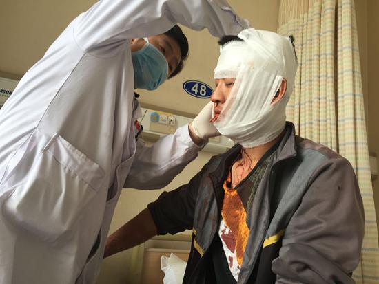 師麗偉(右)見(jiàn)義勇為受傷后,縫合手術(shù)后,師麗偉頭上和臉上纏著一層層紗布,圖為海慈醫(yī)院醫(yī)生為其細(xì)心包扎