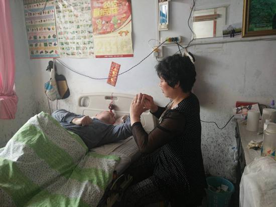 就這樣,她每天早上五點起床給丈夫做飯,給兒子按摩一小時,再給兒子做飯,喂上,夏天給兒子洗澡是最難的時候,兒子一米七八的個子,他身體都僵硬,不會打彎,丈夫未患病以前,還有丈夫一起照顧,丈夫患病后這一切重任就全落在了陶桂玲身上。她把兒子綁在自己身上,硬拉起來,搬到輪椅上,給他洗完澡,再從輪椅上挪到床上。再熱的夏天,再冷的冬天,兒子劉明的身體從未有過褥瘡,沒有過異味,這是連很多親媽都難以做到的,何況還是“后媽”呢。年復一年,日復一日,四千多個日日夜夜,她就這樣照顧著這個破碎的家,無怨無悔。