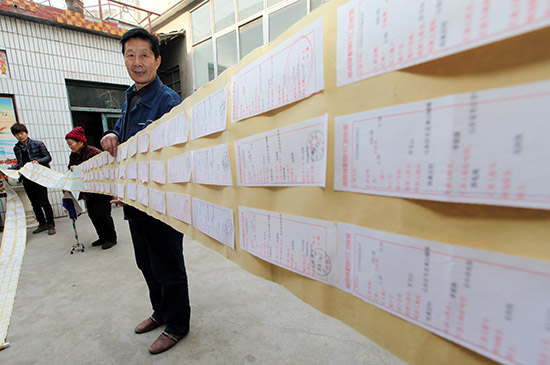 1995年起他堅持每月從做農(nóng)電工的工資中拿出100元錢資助貧困家庭。如今,為了方便保存,他把20年來保留的匯款收據(jù)有序排列粘貼在一起,形成了12米長的特殊“匯款單”。