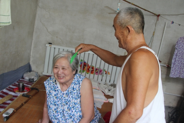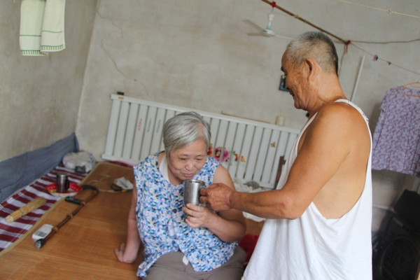 30年前,趙洪斌的妻子陶公美在干農活時身體突然出現了發麻的癥狀,由于當時的醫療條件有限,輾轉多家醫院后,才確診為頸椎瘤。后來經過治療,雖保住了性命,但導致了身體的癱瘓。趙洪斌說:“她動手術至今已經21年了,動手術前基本上就是不能走了,動了手術,好歹的能多少動彈動彈,扶著她多少的能走,但是這幾年越來越不行了,現在大小便都不能自理,離了人不行啊。”年近七十的他,每天的工作就是照顧妻子。妻子在床上躺累了,就把她移到椅子上。天氣好的話,就推著她出去走走。由于上了年紀,現在照顧起妻子來也有些吃力了,每次都是汗流浹背。“就是我照顧她啊,其他人,一般的都抬不動她,有勁的小伙子都抬不動她,老沉了,不過這些年我也習慣了。”