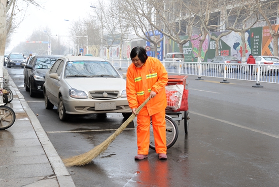 集中落葉的季節(jié)也是她很犯愁的一件事情,2014年11月份的一場狂風暴雨后,街道路面上積滿了厚厚的樹葉,為了確保行人上班時路面潔凈,崔艷會5點就冒著寒雨騎著人力三輪保潔車從家里出發(fā)來到自己的路段清掃落葉,因為風雨未停,樹葉邊掃邊落,新清掃的路面一會又落滿一地,但是她依然堅持一遍遍地清掃。為了保持路面潔凈,午休時間她在路邊買了2個火燒,一口熱水都沒撈著喝,吃完了接著干活,一直干到下午6點多。在一次清雪工作中,因為路面太滑意外摔倒,右手掌和右腳踝扭傷,直到現(xiàn)在右手掌受傷部位的骨節(jié)高出一截,右腳踝陰天就疼痛。