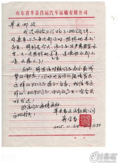 2015年11月25日,莘縣郵政公司發(fā)投部主任的辦公桌上又多了一封來(lái)自客戶(hù)的表?yè)P(yáng)信,這封信來(lái)自莘縣昌運(yùn)汽車(chē)運(yùn)輸公司,署名為蔣學(xué)昌。經(jīng)核實(shí),這封感謝信是寫(xiě)給投遞員孫秀東同志的。蔣先生說(shuō):“我從網(wǎng)絡(luò)上訂購(gòu)了一批紙張,投遞員同志每次都及時(shí)、熱情地送到家來(lái),特別是今天,該同志頂嚴(yán)寒冒風(fēng)雪又一次熱情地送到家來(lái),連碗水都不喝,太感人了…”